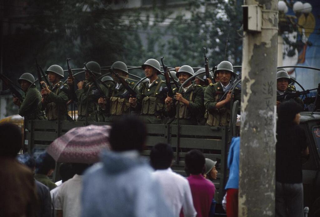 4 июня 1989, 5:00 утра - Грузовик, наполненный вооруженными солдатами, наблюдает как оставшихся студентов выгоняют с площади Тяньаньмэнь