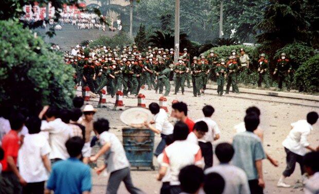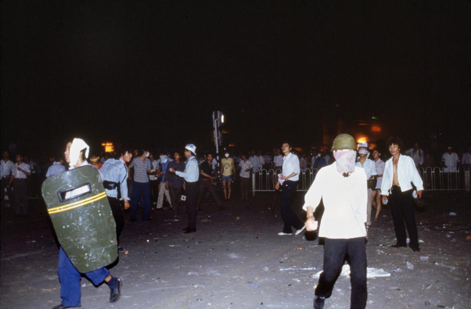 4 июня 1989, 10:00 утра - Студенты бросают камни в полицейский кордон в Чэнду на Народной площади