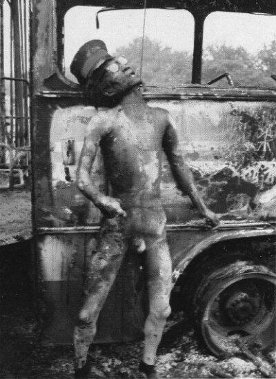 4 июня 1989, после полудня - Дымящиеся остатки целой военной колонны, сожженной жителями Пекина в это утро в Мусиди