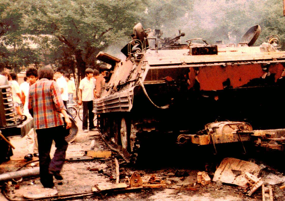 4 июня 1989, 5:25 утра - Последние оставшиеся группы постепенно изгоняются с площади Тяньаньмэнь БТРами