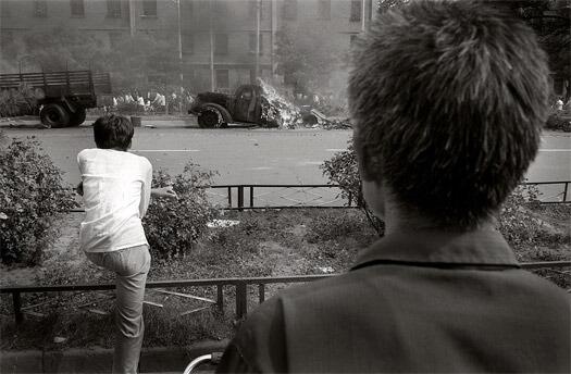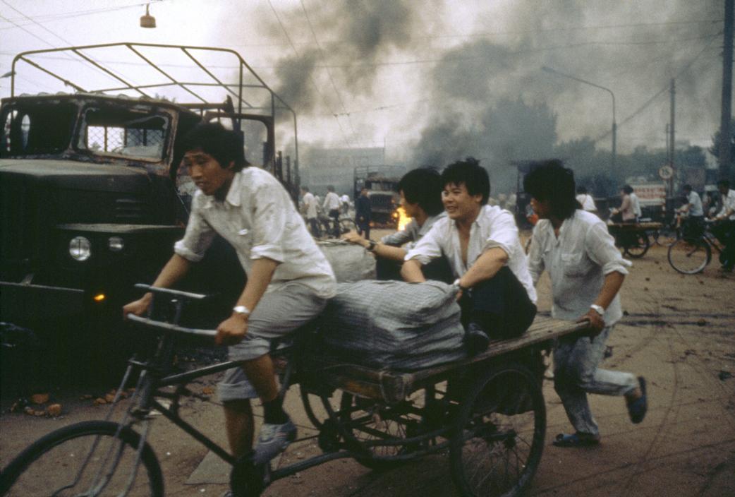 4 июня 1989, 6:00 утра - Местные жители в западном Пекине проезжают через все еще горящую зону боевых действий
