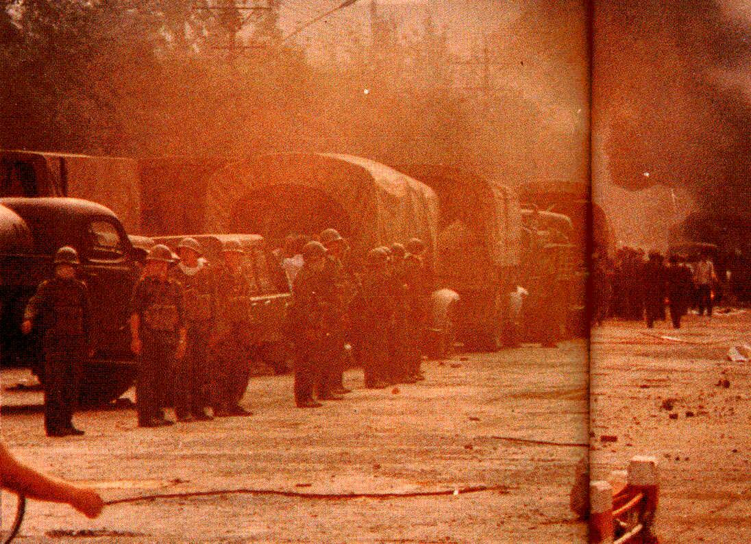 4 июня 1989, 10:45 утра - Солдаты в остановившейся колонне, многие ранены, оставляют машины и ищут убежища в Военном музее