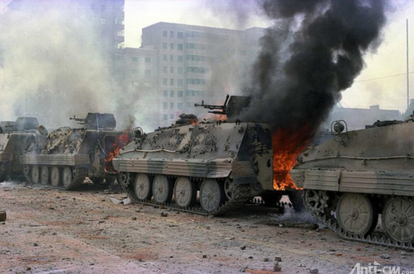 4 июня 1989, 11:00 утра - Горит колонна оставленных БТР, подожженных разгневанными жителями Пекина