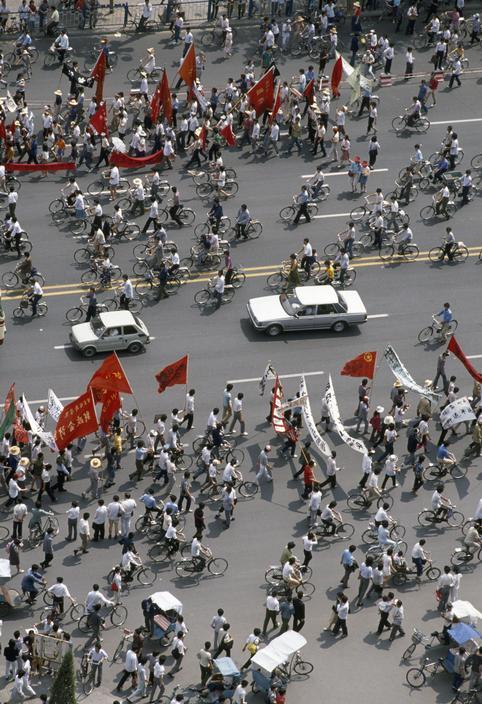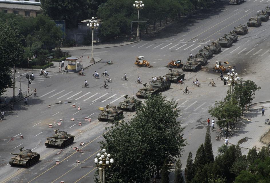 4 июня 1989, после полудня - Велосипедисты объезжают колонну танков, двигающуюся от Тяньаньмэнь на восток по проспекту Чанган