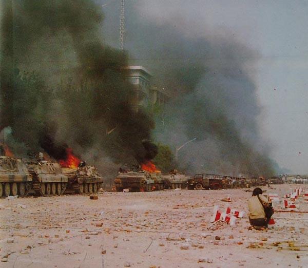 4 июня 1989, после полудня - Горящая колонна военных машин в западном Пекине