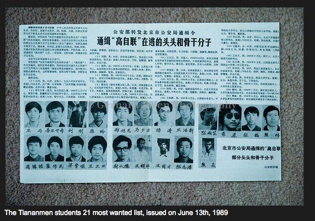 13 июня 1989 - Китайское правительство опубликовало список 21 "самых разыскиваемых" подстрекателей протестов на площади Тяньаньмэнь
